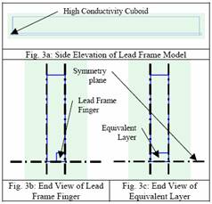 為了檢驗(yàn)引線架區(qū)域采用集成近似所帶來的影響,我們將一個(gè)詳細(xì)的包有塑料外殼的引線架結(jié)構(gòu)的三維描述與一個(gè)熱平衡層的三維描述進(jìn)行比較。根據(jù)平面對(duì)稱性,對(duì)半個(gè)引線架構(gòu)以及與之相連的半個(gè)塑料外殼進(jìn)行單位逼近,再依據(jù)引線架外殼的上下對(duì)稱性,取上半部分建模。具體的幾何學(xué)及對(duì)稱條件的應(yīng)用如下圖所示: