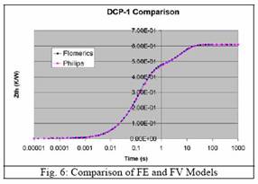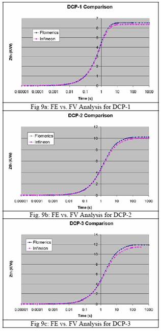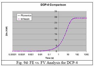 圖10和11的顯示結(jié)果表明晶片粘附層厚度和引線架縫隙對(duì)模型幾乎沒有影響,它與我們所作的基本分析的結(jié)果是一致的。圖9d顯示,DCP-4中兩條曲線的吻合性很好,引線的熱量基本被去除。圖9a至9c對(duì)DCP-1至DCP-3的描繪顯示吻合性比較不好。由于基礎(chǔ)研究認(rèn)為出現(xiàn)這種情況不是在FV模型中使用假設(shè)條件建模造成的,因此這種差異很可能是兩種模型其他方面的不同所至。最顯著的不同是它們的連接桿的幾何表示不同。在FE模型中它有正確的表述,即由沖膜墊一角引出斜向插入引線架齒合面。而在FV模型中,連接桿只是簡(jiǎn)單的從沖膜墊一角伸出與引線架相連,如圖7b所示,而不是斜向連接。然而,對(duì)比FV模型中詳盡的連接桿描述,我們將此作為一種矛盾因素,有待進(jìn)一步的研究。但是,有一點(diǎn)應(yīng)該很清楚那就是兩種模型(FV和FE)的差異要小于不同物理部件的差別。