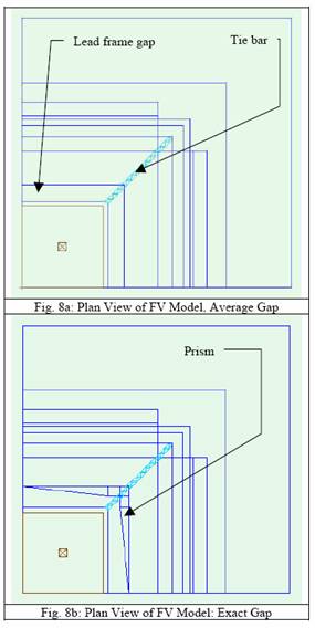 還可估計(jì)引線架插入沖模墊縫隙時(shí)不同表示方法對(duì)建模結(jié)果的影響。下面的圖表是封裝模型及其周圍銅帶的平面圖。如圖所示,沖模墊的一角通過連接桿與封裝體的一角相連。我們用兩個(gè)棱柱實(shí)現(xiàn)這種精確的空隙構(gòu)形。