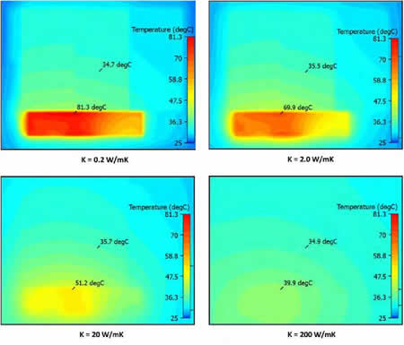 圖1顯示了此項研究中計算出的,自然對流和輻射形成的最大可能的功耗。研究還計算了海平面條件下,環境溫度為25°C,且表面溫度不超過41°C的觸摸溫度時,所能散發的最大總功耗。其中,由Berhe計算出的鋁封裝的最大觸摸溫度為41°C。