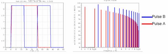 脈沖A,圖中紅線所示,時鐘頻率為20MHz,上升沿下降沿時間為1nS。脈沖B,圖中藍線所示,時鐘頻率為40MHz,上升沿下降沿時間為0.5nS。Pulse A, the red trace, has a 20MHz clock and 1nS rise/fall time. Pulse B, the blue trace, has a