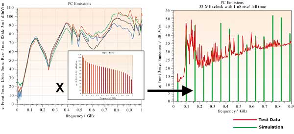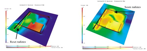 在圖4中,模擬時寬帶頻譜被時鐘頻譜加倍。將試驗結果與在無回波響應腔中取得的測試數據進行對比。盡管復位線沒有采取屏蔽措施,輻射仍在FCC的B類限制范圍之內(由216兆赫至960兆赫的允許最多衰減量為46dBuV/m)。由于在模型中沿縫處沒有電接觸,因此模擬時輻射可能擴大到700兆赫以上。