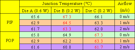 當封裝體內所有芯片的發熱瓦數變成原來的三倍時,如[表四],PIP與POP結構上芯片的溫度分布高低趨勢大致上和兩倍的發熱情況一致,值得注意的是無論是自然對流還是強制對流,在此時,POP (Package on Package)結構在散熱方面都比PIP (Package in Package)結構要為理想。