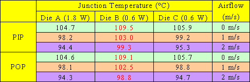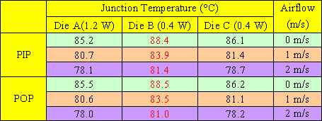 當封裝體內所有芯片的發熱瓦數的變成原來的兩倍時,如[表三],無論是PIP (Package in Package)結構還是POP (Package on Package)結構,Die B都是三組芯片中溫度最高的,由此可發現當芯片的發熱瓦數變高時,芯片的尺寸面積不變的情況下,Die B的發熱密度相對的提高,此時芯片的尺寸面積對散熱的影響會較基板等等其它因素對Die C的影響要來得顯著,造成POP (Package on Package)結構中的Die B在此情況下成為三個芯片中溫度較高的芯片,而強制對流對POP (Package on Package)結構散熱改善比PIP (Package in Package)結構要為理想,在此處依然可以發現。