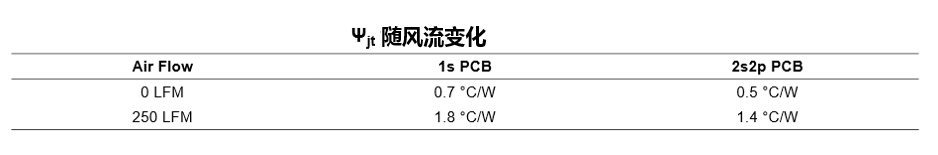 在自然對流下,塑料封裝的ΨJT通常是相對較低的值。這意味著TJ通常只比包裝頂部TT稍熱。管芯僅通過塑料封裝的薄區域與頂表面物理分離。因此,除非頂部被氣流強行冷卻,否則它們之間將有非常小的溫差。較薄型的封裝的自然對流ΨJT值通常小于1℃ / W。并且ΨJT值還會因周圍風流速度的變化而發生變化。
