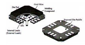 <圖7>所示之LOC(Lead On Chip)型式主要用于TSOP或SOJ等兩面接腳的封裝型式,將導(dǎo)線架延伸至芯片上方,再以雙面膠等黏著材料和芯片連接,好處是打線距離減少,對電性幫助較大,采用此種方式的封裝方式,對TSOP 40而言熱阻約可減少14℃/W。QLP(Quad Leadless Package)型式是將QFP伸出的接腳除去,由于體積減少,因此可歸納為CSP型式,如<圖8>所示,比較7×7mmQFP及7×7mmQLP,熱阻值約可降低25℃/W。
