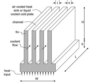 上圖是一個典型的翅片式散熱器的形狀。散熱器翅片之間有流體經過,由于流體黏性的存在,造成流阻,宏觀反映為散熱器兩側存在對應的壓強差。文中所用的公式幾何參數和流動方向參考圖示散熱器的各項標注。