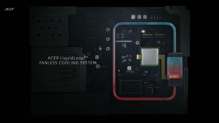 筆者并未實(shí)際看到過Switch Alpha 12真機(jī),遍網(wǎng)搜索也未發(fā)現(xiàn)拆機(jī)圖(想來是機(jī)器相當(dāng)輕薄,如果拆解,復(fù)原難度大)。通過ACER官網(wǎng)的一些描述,其LiquidLoop散熱技術(shù)的概要原理應(yīng)可概述如下: