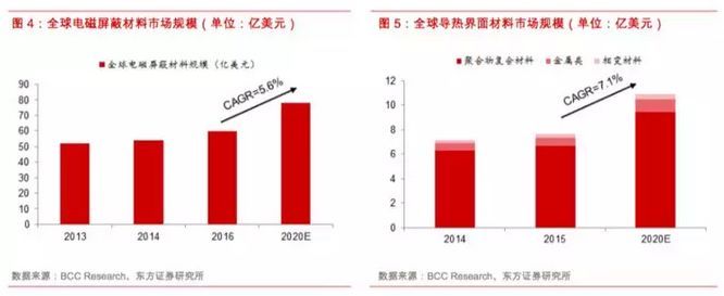 近年來隨著軟硬件技術不斷升級,消費電子產品創新及通信設備升級推動電磁屏蔽和導熱材料市場穩步增長。根據BCC Research的預測,全球EMI/RFI屏蔽材料市場規模將從2016年的60億美元提高到2021年的78億美元,復合增長率近6%,而全球界面導熱材料的市場規模將從2015年的7.6億美元提高到2020年的11億美元,復合增長率超7%。