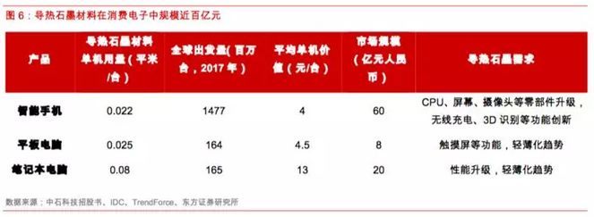 而屬于新興行業的石墨散熱材料,自2011年開始大規模應用于消費電子產品中以來,近年呈現快速發展趨勢,按照150-200元/平米的單價來計算,當前高導熱石墨材料在消費電子領域的市場規模達近百億元人民幣。