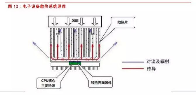 在熱力學中,散熱就是熱量傳遞,方式主要有熱傳導,熱對流和熱輻射等三種。根據熱的傳遞方式,電子設備散熱系統可以由風扇、散熱片(如石墨片、金屬散熱片等)和導熱界面器件組成。導熱界面器件功能是填充發熱元件與散熱元件之間的空氣間隙,提高導熱效率,通常用于通訊設備、計算機和外設、功率變換設備、存儲模塊、芯片級封裝等領域,而散熱片通過導熱界面器件與電子元件表面接觸,利用其在水平方向上的導熱性,迅速降低電子產品工作時發熱元件所在位置的的溫度,使得電子產品溫度趨于均勻化,擴大散熱表面積以達到降低整個電子產品的溫度,提高電子產品的工作穩定性及使用壽命。