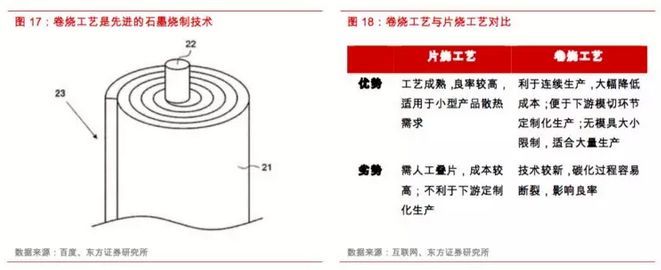 從生產工藝角度來看,導熱石墨膜主要在基材處理的基礎上,通過高溫碳化、石墨化等環節加工而成,而高溫燒制的工藝可分為片狀燒制和卷式燒制技術。片燒石墨是將聚酰亞胺膜(PI膜)裁剪好后以間隔疊片的方式放入模具中,對其施壓、碳化并石墨化的過程。而卷燒石墨是近年來的新興技術,將PI膜卷繞于卷筒上,進行碳化熱處理,再進行石墨化熱處理,以形成卷筒狀石墨膜的過程。相比于片燒工藝,卷燒石墨技術有著節省人工疊片流程的優點,且利于后續工藝的連續生產性,能大幅降低成本,同時成功的卷燒流程能使石墨膜具有良好的機械強度,沒有模具大小的限制,因此十分適用于5G時代顯著增長的散熱需求,特別在大型設備(如基站)中具備廣泛應用前景。