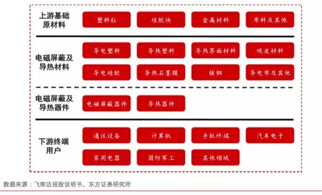 電磁屏蔽和導熱材料及器件處于產業鏈的中游,上游是塑料粒、硅膠塊、金屬材料和布料及其他等基礎原材料,下游是通訊設備、計算機、手機終端、汽車電子、家用電器和國防軍工等終端用戶。其中,電磁屏蔽和導熱器件是在電磁屏蔽和導熱材料的基礎上進行二次加工處理。