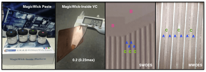 “Level 3 PWS COMBO技術理論上是一種在超狹窄空間內橫向的平衡液體通道和蒸汽通道效率的超薄VC設計和制造技術。通過新穎的流道設計和不同的如魔術般的漿料配方, 采用PWS COMBO技術制造的MagicWick-Inside VC元件, 若厚度僅為0.2mm(公差為+0.02),而尺寸面積為5000mm2時,在5W功率測量下可獲得良好的效率。在吸熱區與冷凝區量測點之間的距離在70mm 時量測到的表面溫差(ΔT)約在2℃左右。歸功于在液體流道的中MagicWick A(毛細厚度~35μm)和在輔助氣道中MagicWick C(毛細厚度<10μm)的協同運作機制,液相工作流體從冷凝區回流到吸熱區的反重力輸送速度可超過20mm/s。”