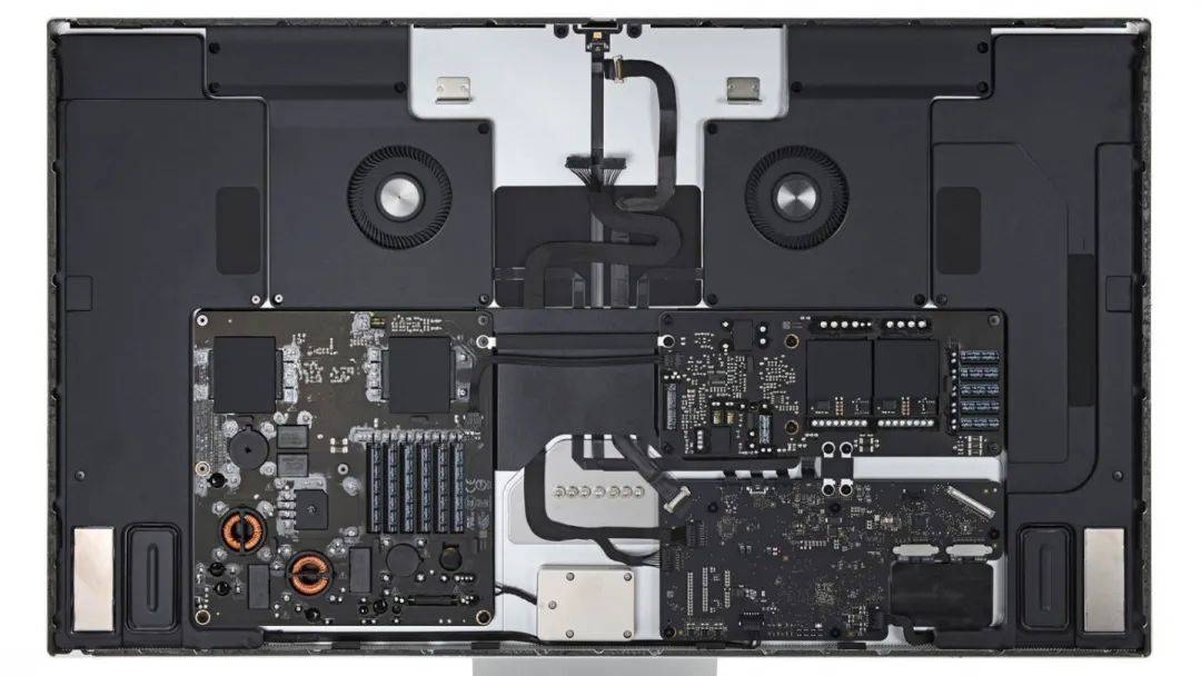 如圖所示,蘋果 Studio Display 顯示器內部構造依舊是“蘋果式”的整潔,兩個小風扇為面板以及內部組件散熱。主板上黑色屏蔽罩下面應該是 Studio Display 搭載的 A13 芯片以及內存 / 閃存芯片。