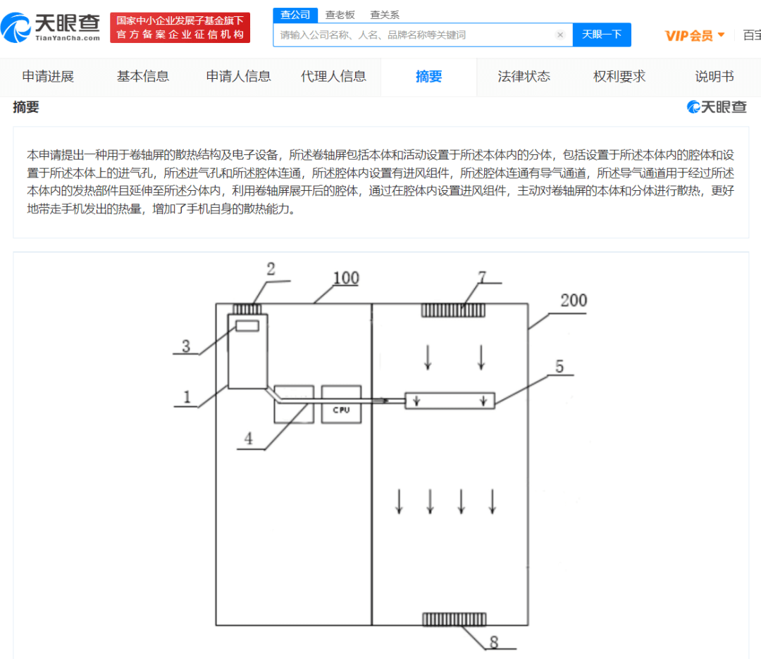 專利摘要顯示,所述卷軸屏包括本體和設置于本體內的分體、腔體,以及本體上的進氣孔。其中,進氣孔和腔體連通,腔體內設置有進風組件并連通導氣通道,導氣通道經過本體內的發熱部件且延伸至分體內,從而利用卷軸屏展開后的腔體,通過進風組件主動對卷軸屏的本體和分體進行散熱,增加手機自身的散熱能力。