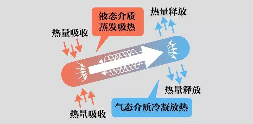 當熱管的一端受熱時,毛細芯中的液體蒸發汽化,蒸汽在微小的壓差下流向另一端,放出熱量凝結成液體,液體再靠毛細力(或重力)的作用,沿多孔材料流回蒸發段。如此循環不已,熱量便從一端傳到了另一端。