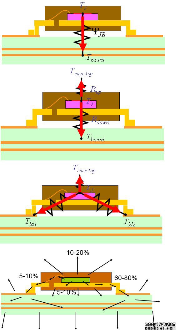ΨJB是結到電路板的熱特性參數,單位是°C/W。熱特性參數與熱阻是不同的。與熱阻θJB測量中的直接單通路不同,ΨJB測量的元件功率通量是基于多條熱通路的。由于這些ΨJB的熱通路中包括封裝頂部的熱對流,因此更加便于用戶的應用。