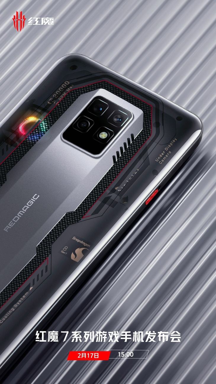 紅魔7系列氘鋒透明版后置矩形攝像頭模組為居中放置,應該是三攝組合,后蓋兩側為透明設計,普通版應該會有所不同。手機最高支持135W魔閃快充+5000mAh大電池,行業首發165W氮化鎵充電器,15分鐘即可充滿100%。手機采用驍龍8處理器+滿血版LPDDR5+UFS 3.1組合,安兔兔跑分可達1101769分,新品將在2月17日15點發布。