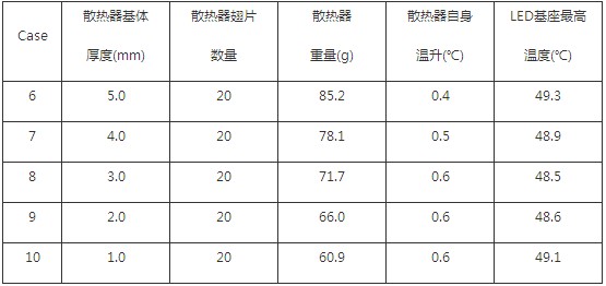 以下對散熱器基體厚度進行優化,散熱器內孔孔徑不變,翅片外圍直徑不變,僅改變散熱器基體的厚度,對模型進行熱仿真得到LED基座最高溫度見表2。