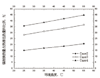 (2)隨著環境溫度的升高,照明產品外表面輻射換熱量逐漸增大,輻射換熱有所強化,輻射換熱量占熱源總熱量的比例逐漸增大(圖10)。原因是輻射換熱量與熱源及冷源(即環境)絕對溫度4次方的差值成正比。所以,當環境溫度升高時,熱源溫度的升高相對較少,結果是熱源與環境的溫差有所減小。