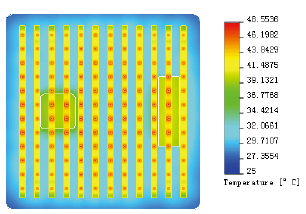 另外,散熱器自身的溫升代表了散熱器溫度均勻性,即散熱器自身的熱阻或者效率。該值越小,散熱器的熱阻越小、效率越高。該值可以作為散熱器設計的重要參考標準之一,另外散熱器表面的對流傳熱系數、輻射換熱系數等值也是散熱器設計的參考標準。