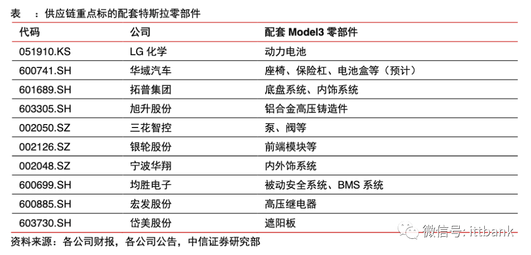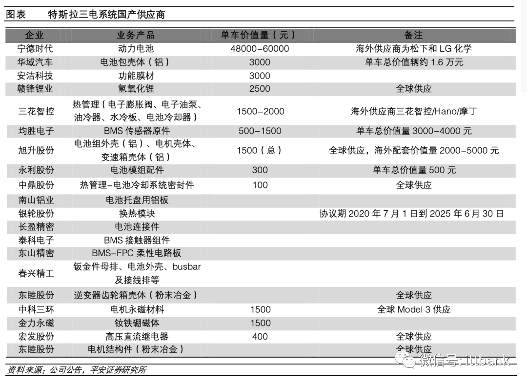 這其中,由于有著傳統燃油車領域的豐富經驗,自主品牌在傳統零部件中的底盤、懸架系統,玻璃,內外飾總成等領域均已經具備了很好的配套能力和基礎。成熟的配套經驗、充足的產能供給、具有競爭力的產品價格成為了這類公司突破特斯拉的核心能力。國產化率較高的部分主要集中在車身底盤、內外飾等傳統零部件以及汽車電子中的硬件部分,在電機電控、控制芯片和系統軟件等電動車關鍵零部件方面國產化進度暫時較慢。由于汽車產業鏈多數零部件運輸成本較高,國內采購更有優勢,因此,特斯拉在國內的暢銷也會帶動相關產業鏈的銷售提升。研發實力強、規模優勢較大的電池、電池材料、熱管理系統、電驅動系統龍頭企業將會陸續進入特斯拉供應鏈,獲得較大的成長空間和產品溢價。